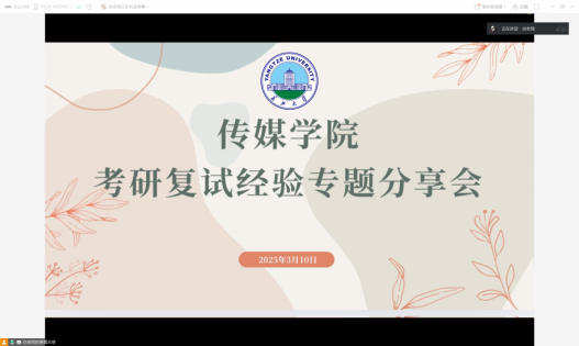 (通讯员:张桃林)为助力考研学子充分备战复试,hg皇冠官网于3月10日19时30分举办考研复试经验专题分享会。此次分享会由团委书记肖淳老师主持,特别邀请到2024年考研成功的李自谦与庞梦蝶两位优秀学姐为同学们传授复试经验。