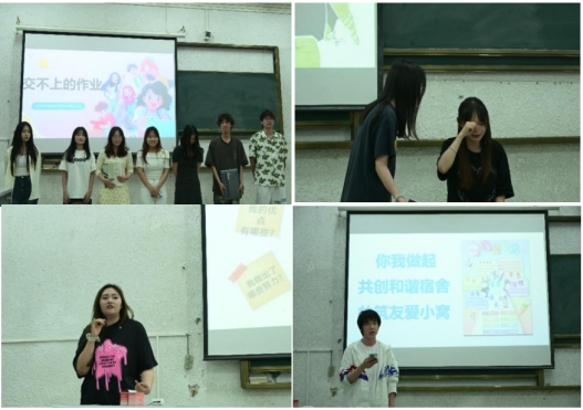 班会以《如何正确看待心理健康》短片开场,辅导员朱晓晖结合案例解析心理健康的重要性,破除“心理问题即脆弱”的误解。随后,《作业未交怎么办》《宿舍那些事》《我又失恋了》三个情景剧生动呈现了大员工常见困扰,员工结合自身经历展开讨论,分享应对压力的经验。产品设计三班薛凯月同学发起“我的优点有哪些”互动环节,倡导正视自身价值,增强自信,并通过班级社交活动建立支持性人际关系。