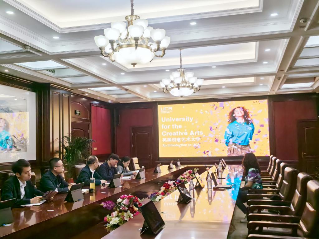 英国创意艺术大学中国办公室副主任Smile Lu从不同方面介绍了英国创意艺术大学的专业设置、专业排名情况、学校的软硬件条件、以及杰出校友代表。英国创意艺术大学代表、校方代表、院方代表现场还就“3+1”本硕连读合作项目事宜进行了充分的讨论与研究。