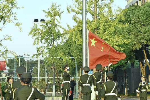 早晨7点,升旗仪式正式开始。在沐熙下,全场肃立,国旗护卫队护送五星红旗徐徐升空,全场注视国旗,奏唱国歌。