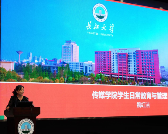 党委副书记魏红洁为大家细致的讲解了《传媒员工日常教育与管理》,反复强调了最重要的是生命安全,要求各位员工严格执行在校一日,打卡一次的规章制度,确保员工人身安全在学校管控之下。魏红洁书记又为大家细致的讲解了本院各项处分条例,更举出违纪实例,让员工引以为戒。最后,魏红洁书记为大家介绍了考研、保研的相关事宜,以及各类员工赛事,表示鼓励大家参与其中。介绍比赛时,同学们纷纷举起手机拍照记录,这让魏书记以及在座的全体老师十分欣慰,展现了长大学子进取向上的精神风貌!