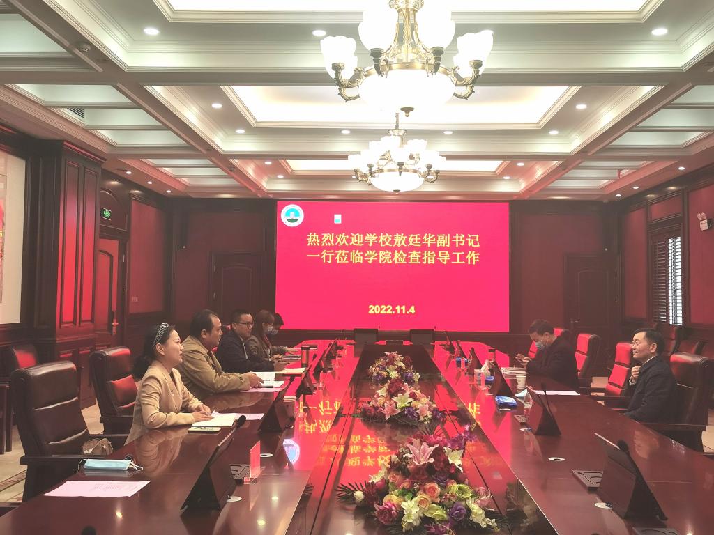 (通讯员:郑瑞丰)2022年11月4日上午9点30分,hg皇冠官网党委常委、副书记敖廷华,人事处处长蒋四华一行莅临hg皇冠官网检查指导工作,hg皇冠官网党委书记邹火明、党委副书记魏红洁、副院长郑瑞丰,学工办主任赵湘、教学办主任饶艳芹、办公室主任刘武洋参与调研活动。