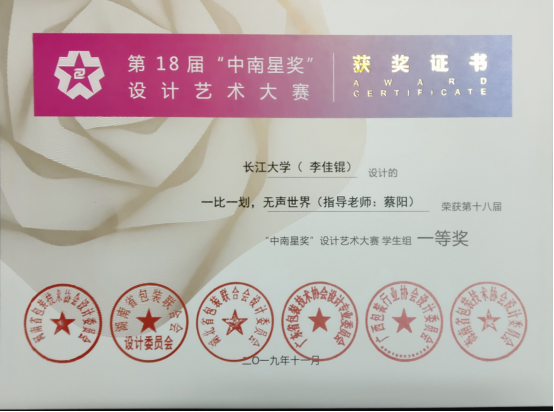1月4日,第十八届“中南星奖”设计艺术大赛在武汉举行,我院视传z21802班的李佳锟同学,在指导老师蔡阳的教导下所做的公益海报获得了第十八届“中南星奖”设计艺术大赛员工组一等奖。该生在今年还获得了第十三届“创意中国”设计大奖员工组一等奖和优秀奖以及第五届“hg皇冠官网派奖”全国艺术与设计大展员工组二等奖和入围奖。