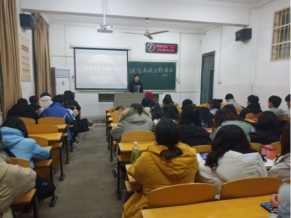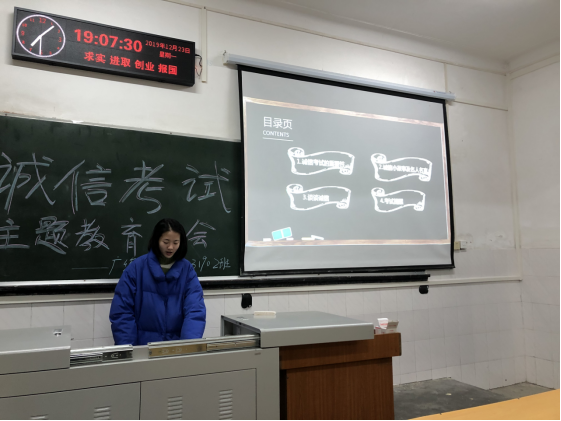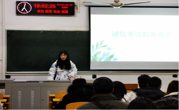 12月19日19点,产设31901班全体同学在2教206教室举办了诚信考试的教育主题班会,班会由班长聂荣华同学主讲。班长通过PPT给同学们介绍了考试的注意事项。班长与同学们讨论了当代大员工诚信的现状,并列举出了一些考试中不诚信的例子以及考试舞弊所带来的不良后果,希望同学们引以为戒。