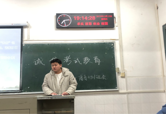 12月29日19点,播音31902班开展了“以诚信考试为荣,以考试舞弊为耻”的主题班会,班会上着重强调了三点要求:1、合理安排考试复习规划,班上形成良好的期末复习氛围;2、提高自身修养,做一名诚信大员工。我们要以诚信的态度对待每一场考试,考出真实水平。3、严肃考风考纪,端正学习与考试的态度,严格遵守考试规章制度,实事求是,杜绝一切考试作弊形式。