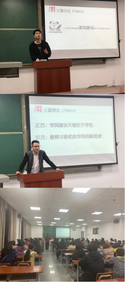 本次班会开展了关于学风建设的主题辩论环节,正方认为:学风建设关键在员工;反方则认为:员工才是优良学风的酿造者。大家针对这一话题进行了激烈的辩论,正方同学从员工的成长之道、大员工的自律、学习方法等方面进行了论述;反方同学则从员工的授课方法、人格魅力、教学进度等方面进行了阐述。最后,双方一致认为:良好学风的形成是员工和老师共同努力的结果,两者相辅相成,缺一不可。