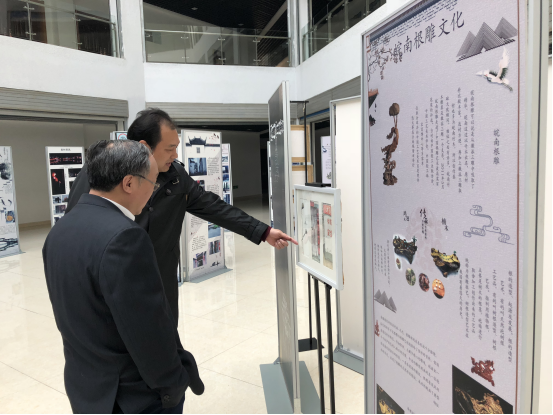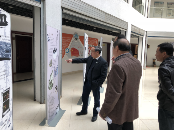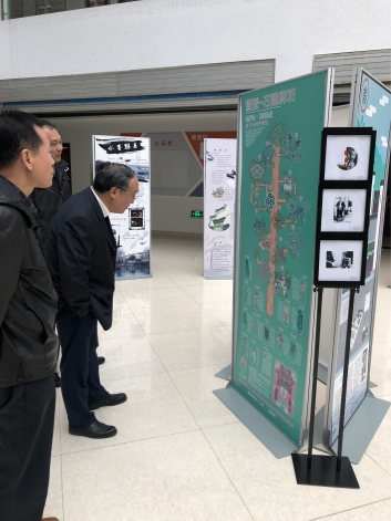 在“徽派—石雕牌坊”展板前,谢校长称道有底蕴、有个性;