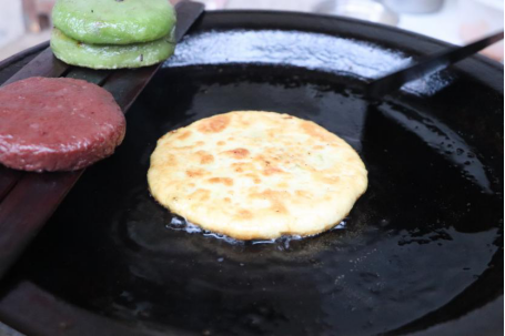 当地村民在自家门前摆着小摊,叫卖着当地特产