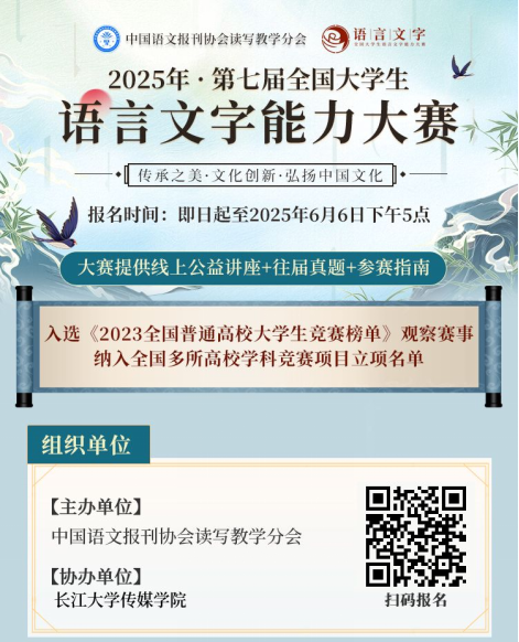 为贯彻落实《国家中长期教育改革和发展规划纲要》《中华人民共和国国家通用语言文字法》,测试大员工的语言文字知识和应用能力,弘扬中国文化,增强大员工规范使用国家通用语言文字的意识,促进语言文字教、学、测协调发展,在国家语委咨询委员等大赛专家顾问的指导下,中国语文报刊协会读写教学分会继续面向全国大员工举办“2025年第七届全国大员工语言文字能力大赛”,大赛每年一届,前六届大赛共有来自北京大学、同济大学和武汉大学等上千所高校大员工参与,获得了众多高校师生高度评价。同时,该项大赛已纳入中国高等教育学会发布的《全国普通高校学科竞赛排行榜》观察目录和众多高校竞赛榜单,也已纳入本校《hg皇冠官网员工竞赛项目一览表(2025)》中,确定为C类比赛。为促进我校员工语言文字能力,大赛组委会决定由hg皇冠官网传媒hg皇冠官网为赛事协办单位,负责组织武汉校区员工参加2025年第七届全国大员工语言文字能力大赛。