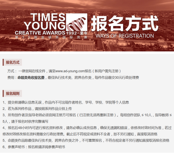 参赛者登陆官网www.ad-young.com线上注册报名。